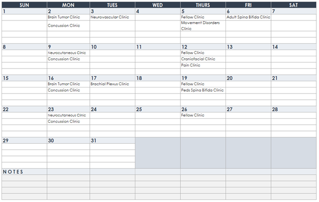 The ACPNF-certified pediatric fellowship entails a rigorous, comprehensive one year training, exposing the fellow to 540+ annual case volume with significant exposure to all pediatric neurosurgery subspecialty disciplines. Four pediatric faculty run 1-2 operating rooms daily on average, with extensive experience in training previous fellows and residents.