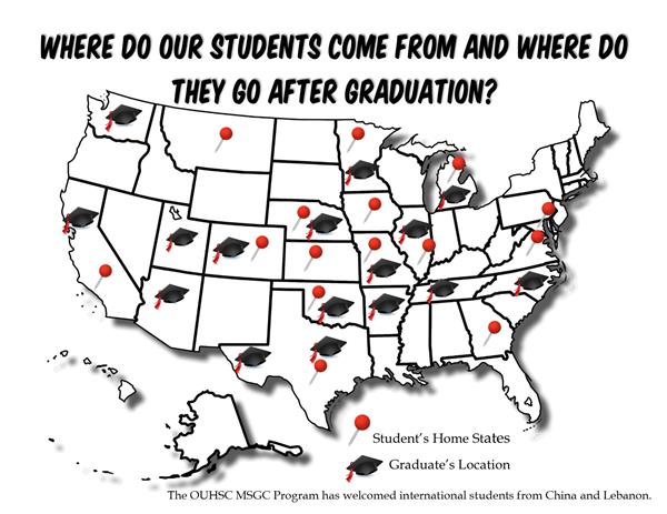 OUHSC MSGC graduates are employed both locally in Oklahoma and in a variety of states around the US, including Texas, Colorado, California, Arkansas, Michigan, Washington, Utah, Arizona, Missouri, North Carolina, New York, South Carolina, Minnesota, Illinois, Nebraska and Tennessee. They are working in a variety of settings and specialties, including general genetics clinics, cancer genetics centers, prenatal clinics, assisted reproductive technology centers, and laboratory, both clinical and research. They are working both in academic centers and private practices around the US. We consistently receive positive feedback from employers about the success of our graduates in the genetic counseling profession and from graduates about the professional preparation they received here at the University of Oklahoma Health Sciences Center.