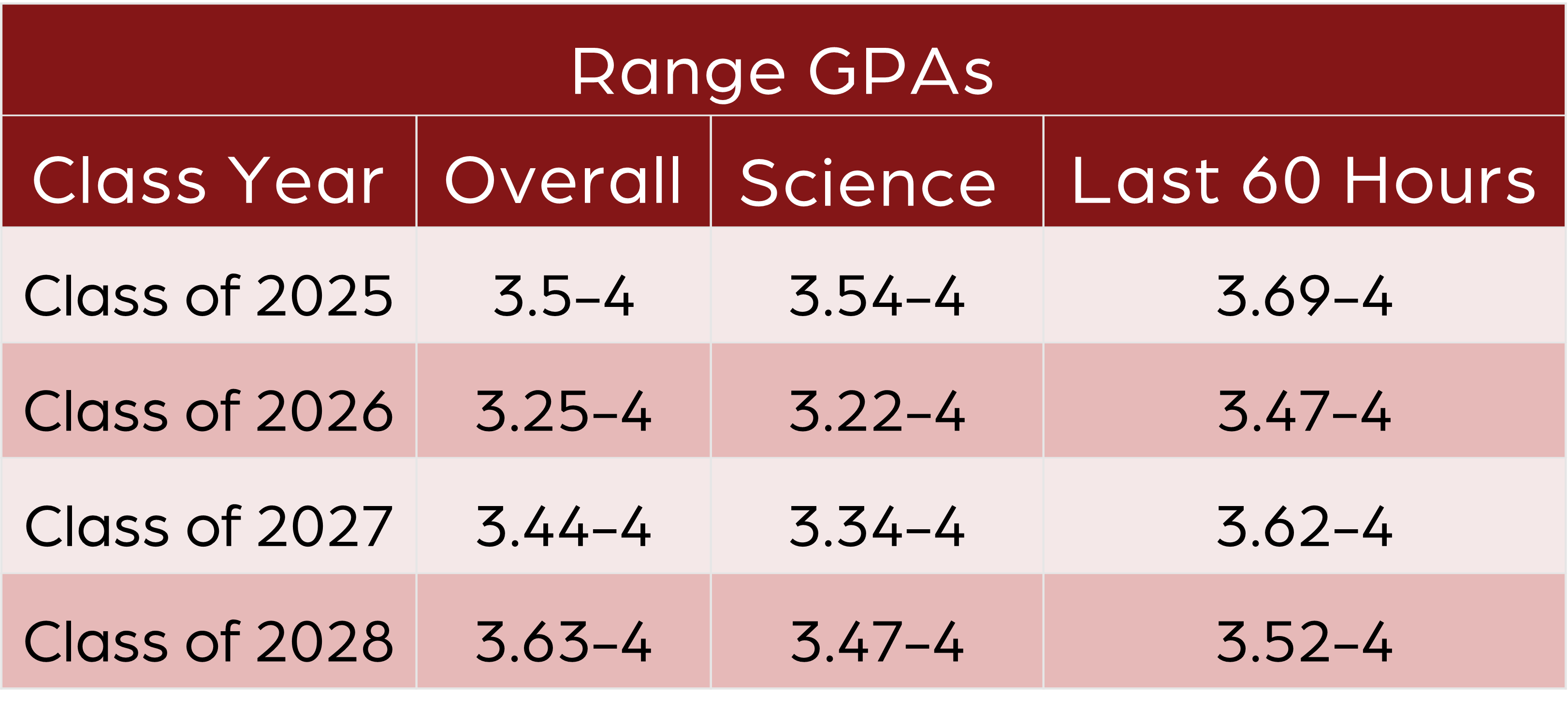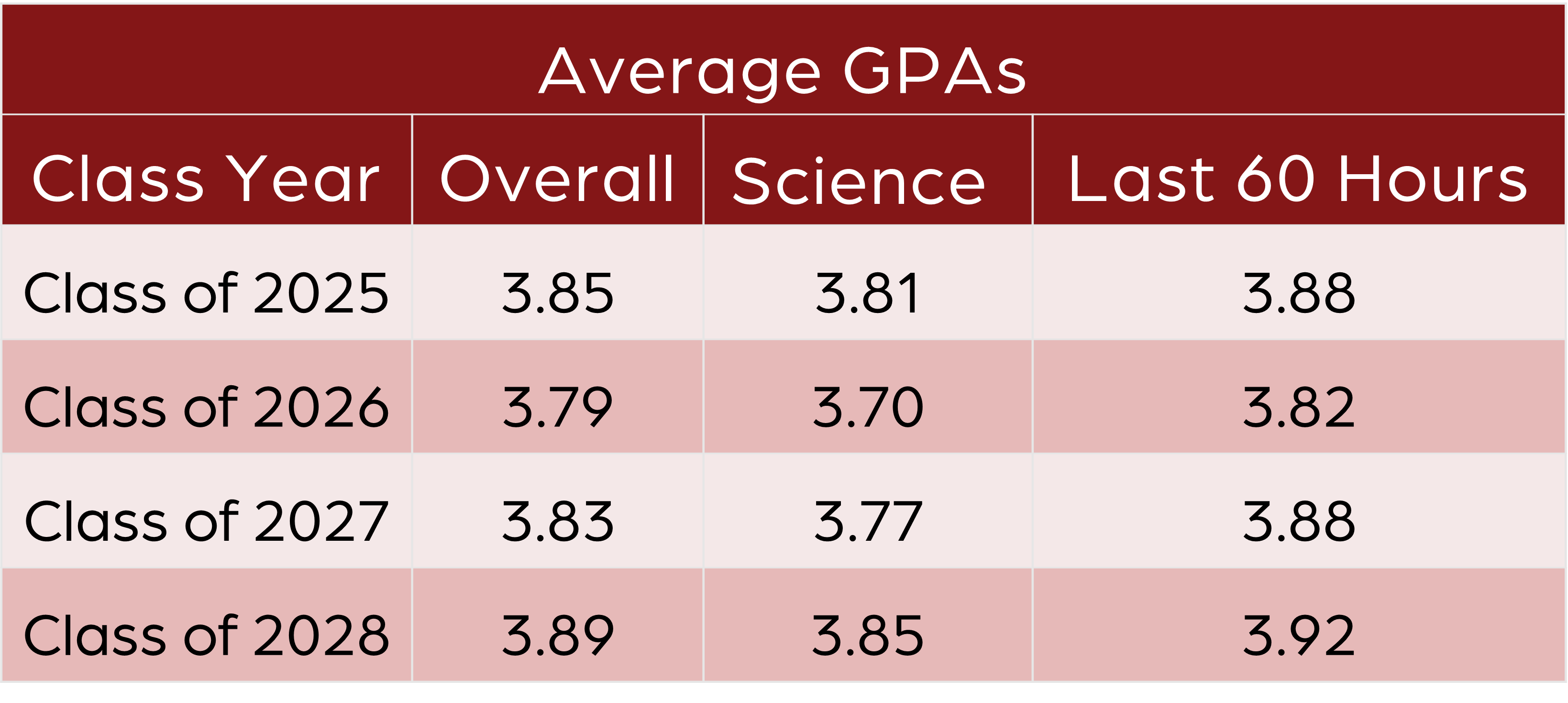 - An overall cumulative GPA of 3.0 on a 4.0 scale and all prerequisite coursework with a minimum GPA of 3.0. Scoring will be on a weighted scale, with science GPA carrying the most weight. Applicants are selected for interviews based on their academic performance. Preference will be given to applicants with higher GPAs. Please see the average GPAs of students accepted by class below for competitive measure.